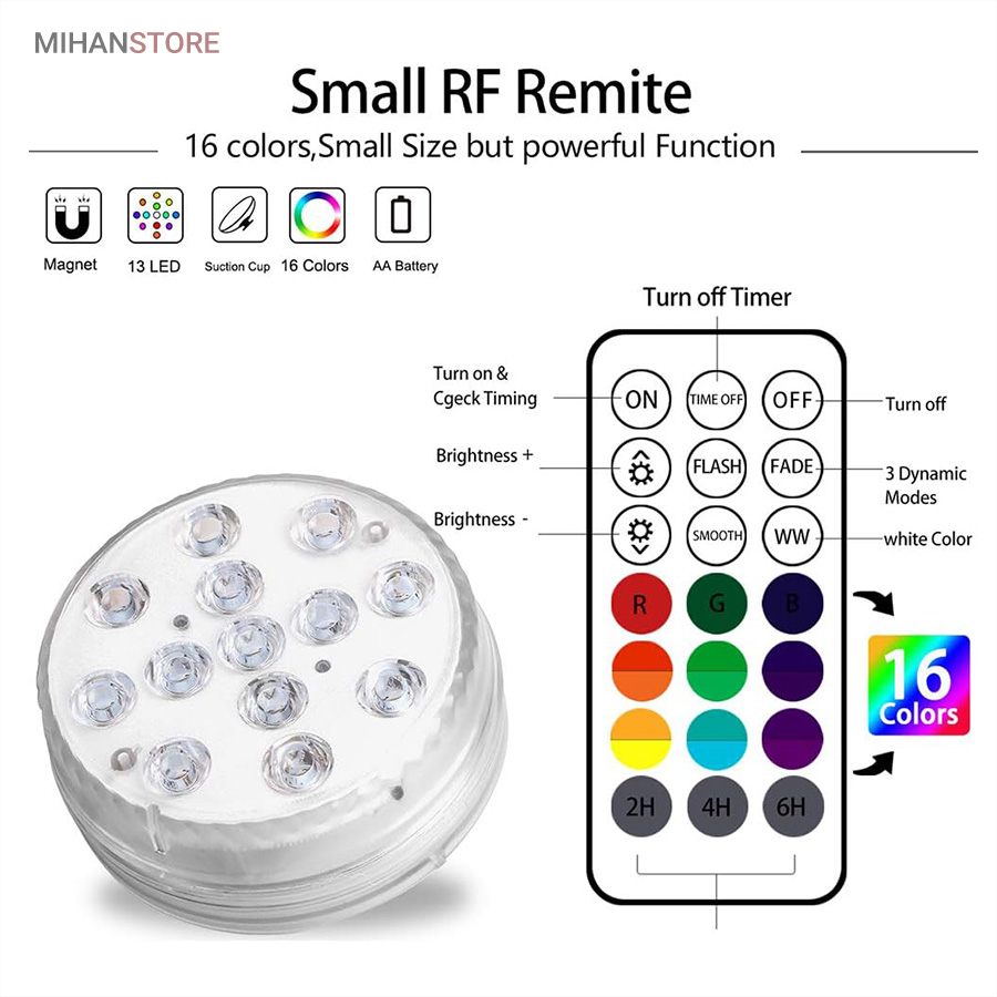 چراغ LED ریموت دار ضد آب دارای LED RGB قابلیت تولید انواع رنگها را دارد. ضمنا با توجه به داشتن ریموت کنترل امکان کنترل از راه دور را فراهم میکند. این پک LED می تواند رنگها و نورها را بصورت مستقل و یا ترکیبی و با حالتهای متفاوت در سرعت چشمک زدن و تغییر رنگها از طیفی به طیف دیگر برای ایجاد جذابیت تولید نماید. با استفاده از 3 عدد باتری نیم قلمی امکان کار تا 72 ساعت بصورت مداوم برای این لامپ وجود دارد.